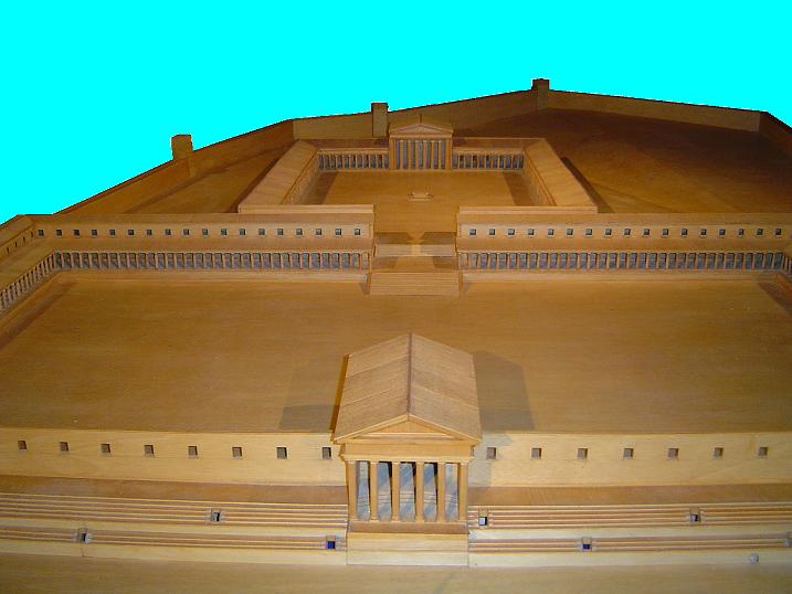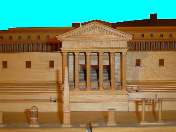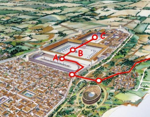 Dando un cuarto de vuelta al circo, y pasando junto al Praetorio entramos por la impresionante puerta principal (A) a la primera terraza del Forum Provincial (B). En esta primera terraza se encuentra la basílica y las tiendas y tabernas mas lujosas de la ciudad.