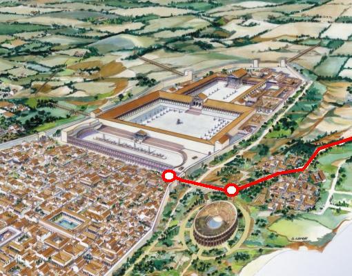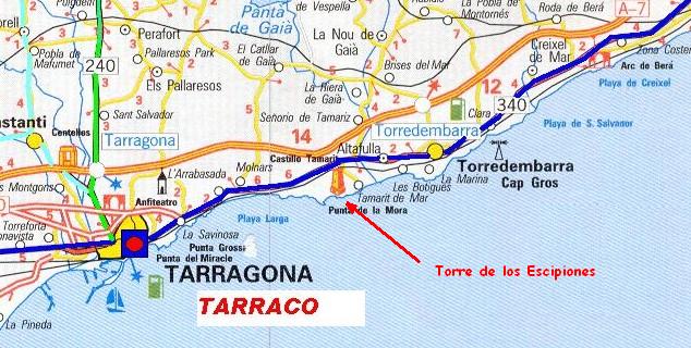 A partir de aquí la Vía Augusta concentra una densidad de trafico parecida a las calzadas cercanas a la capital del Imperio. Con suaves curvas para salvar las innumerables colinas repletas de villas rusticas y casonas de lujo vamos acercándonos a ciudad. La vía esta salpicada por panteones altivos y lujosos; uno de ellos la llamada TORRE DE LOS ESCIPIONES. Construcción funeraria que nos da la bienvenida al área metropolitana de Tarraco.