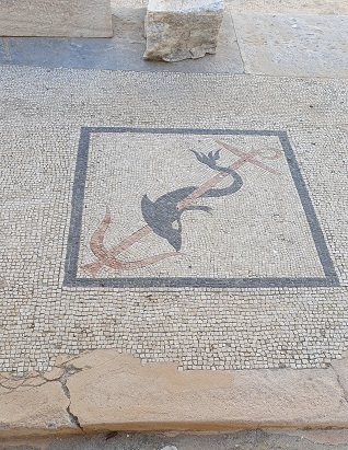 Continuamos por la Casa del Tridente. Accedemos a través de la puerta principal a un gran patio central con un peristilo rodio de columnas dóricas e impluvium. La Casa del Tridente fue probablemente el hogar de un rico comerciante o capitán sirio, porque los elementos decorativos de las columnas (los "prótomos"), leones a la izquierda y toros a la derecha, eran símbolos de los dioses sirios Hadad y Atargatis.
