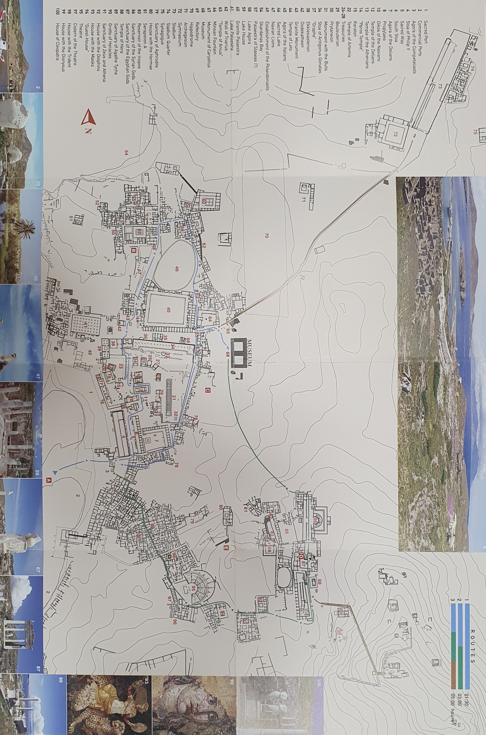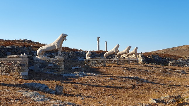 Avenida de los Leones. Conjunto escultórico de mármol dedicado a Apolo siglo VII a.e.c. De los 9 leones quedan sólo 5 enteros y 3 parciales. Esculpidos en mármol de Naxos. Los leones miraban al lago sagrado. Un león fue llevado como botín a Venecia. Los originales están en el museo.
