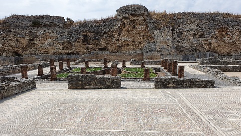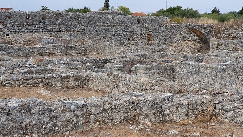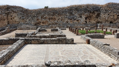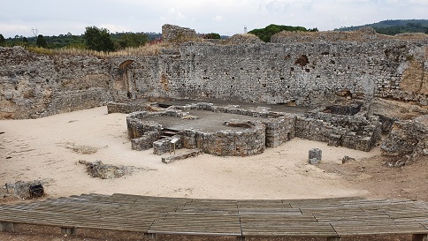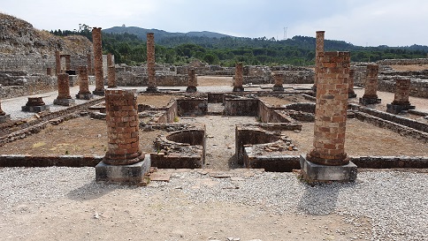 provincia romana de Lusitania. Destaca la belleza de los mosaicos de Conímbriga. Al yacimiento accedemos por la calzada romana de Olisipo a Bracara Augusta, que discurría por la ciudad de Coimbra. La Muralla defensiva es del siglo IV. Con un recorrido de 1,5km sustituye y refuerza la muralla de época de Augusto. Lo que no impidió el asalto de la ciudad por los suevos, en 468. Con la construcción de la muralla se abandonó la zona de la puerta sur que había sido habitada desde el siglo I. Las tiendas, las casas y las termas fueron abandonadas y en el siglo V se reutilizó como necrópolis.