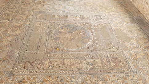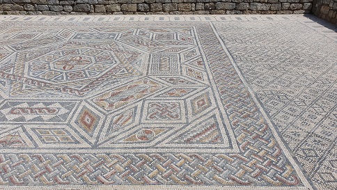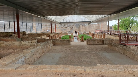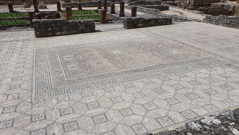 La casa del tridente y la espada fue excavada en 1936-62. Es una casa de tamaño medio. Es un conjunto de tres recintos integrados en una casa más grande, que sin embargo son independientes. El mosaico formaba parte del cubículo que daba al peristilo. El mosaico se cubrió para protegerlo y en enero de 2018 se descubrió, limpió y digitalizó. Foto: http://www.conimbriga.gov.pt/index.html