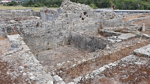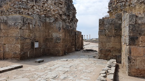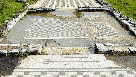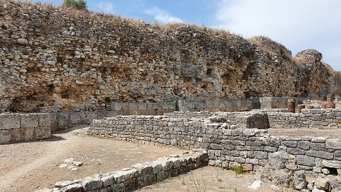A la izquierda de la calzada podemos visitar, las tiendas al sur de la calzada, la casa de la Cruz Esvástica, la casa de los Esqueletos, las termas de la muralla y la muralla. La casa de la Cruz Esvástica pertenecía una familia acomodada. Data del siglo I, reformada en el siglo II. Los mosaicos datan de mediados del siglo III. Posteriormente la casa fue demolida para construir la muralla. Los romanos consideraban la cruz esvástica como un símbolo solar de buena suerte. la casa fue escavada y restaurada en 1940-50.