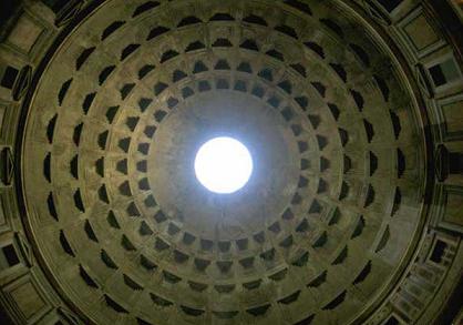 señalando que fue erigido por Agripa. Realizado de opus caementicium sobre un armazón de madera. Es la mayor cúpula del mundo construida con este sistema. Es perfectamente esférica y se apoya sobre un muro cilíndrico de seis metros de espesor. La claraboya es la única fuente de luz. La lluvia penetra en su interior pero es evacuada por sumideros en el pavimento. La
