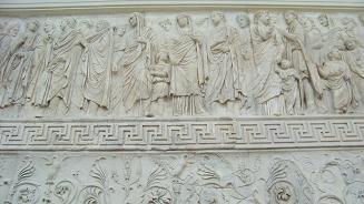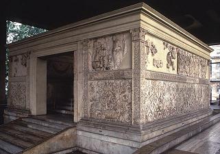 Ara Pacis El Ara Pacis fue el altar erigido por Augusto a la diosa de la Paz, entre los años 13 y 9 a.e.c., en el Campo de Marte, para glorificar la grandeza del Estado romano. Es una estructura rectangular en mármol de Carrara, dentro del cual a través de uno escalones se accede al altar, conmemorativo de la victoria en la Galia y España. Tiene bajorrelieves mitológicos del nacimiento de Roma, la procesión del Emperador y su familia, e imágenes de Augusto, Agripa, Julio Cesar y Tiberio y una reproducción en bronce de Augusto.