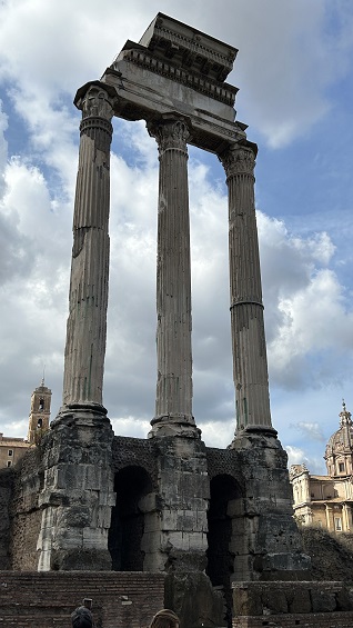 Templo de Cástor y Pólux Templo de Cástor y Pólux (Dioscuros), fue construido por Aulo Postumio Albino en el 484 a.e.c, respetando el voto realizado por su padre durante la batalla junto al lago Regilio en el 496 a.e.c. Narra la leyenda de los gemelos durante la batalla en la que condujeron a los romanos hacia la victoria contra los Tarquinos y los Latinos. En el lugar donde bebieron sus caballos al llegar a la ciudad, junto a la fuente Yuturna, fue erigido el templo de Castor y Pólux. En tiempos de República, ocasionalmente se celebraban en este templo las reuniones del Senado y a partir de mediados del siglo II a.e.c, el podio se convirtió en tribuna para magistrados y oradores durante los comicios que tenían lugar en esta parte de la plaza del Foro.