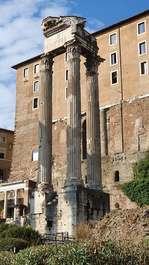Templo de Apolo Sosiano El Templo se halla junto al Teatro de Marcelo. Se conservan tres columnas corintias de 14m, muy reconstruidas con acanaladuras anchas y estrechas alternativamente y parte del friso. Se puede apreciar el límite del pódium. El templo de Apolo medico, fue erigido en el 431 a.e.c, restaurado en el 353 a.e.c y reconstruido en el 34 a.e.c. por el cónsul C. Sosius.