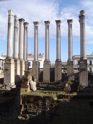 Para su edificación fue necesario aterrazar, la meseta resultante dio lugar a la gran plaza sobre la que se erige un templo próstilo, exástilo y pseudoperíptero sobre podium de tres metros y medio de altura. Para contener el impresionante volumen de tierra se empleó un sistema de contrafuertes en cremallera conocido como las antérides. Esta zona estaba ocupada desde la fundación de la ciudad hasta la primera mitad del siglo I. Con la construcción del templo se desaloja la zona, y comienza la construcción en época del emperador Claudio (41-54) culminándose con Domiciano (81-96), momento en el que se le dota de agua con el Aqua Nova Domitiana Augusta . Sufrió algunas modificaciones en el siglo II, coincidiendo con el cambio de ubicación del foro colonial que se traslada al entorno del actual convento de Santa Ana.Ver Templos Romanos