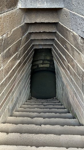 La escalera trapezoidal está compuesta por 25 escalones de basalto,