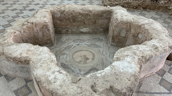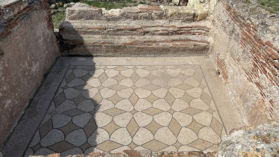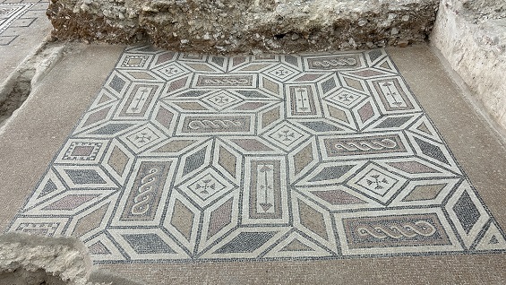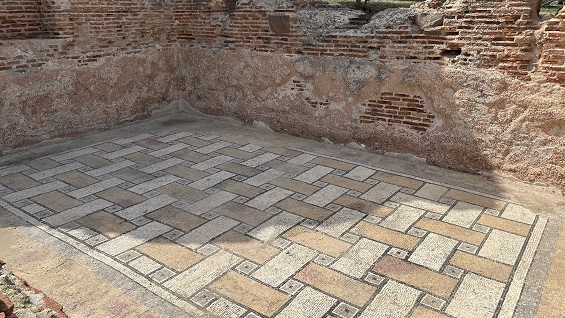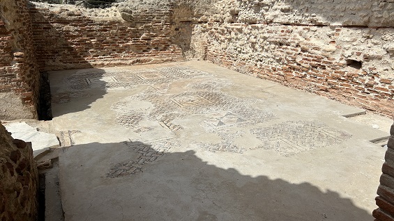 con el suelo decorado con mosaicos, partes de los cuales se exhiben